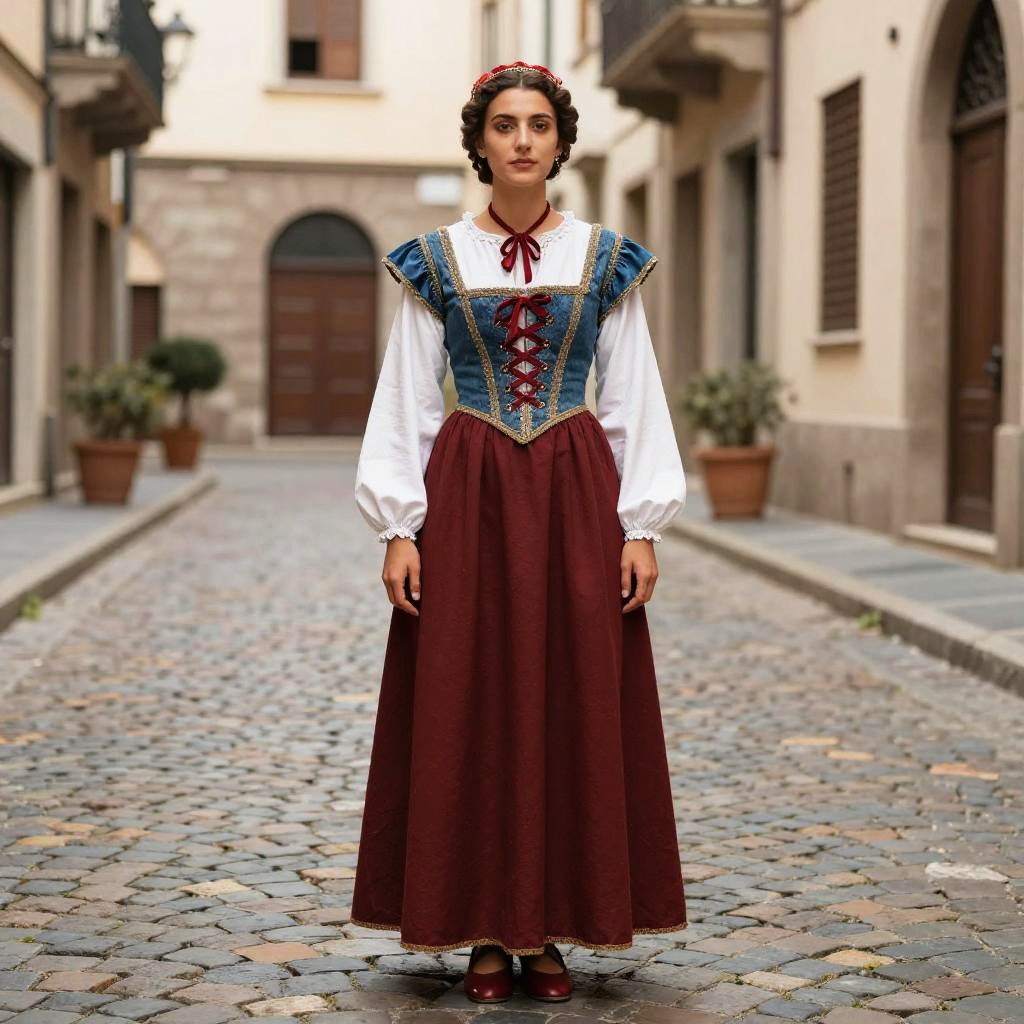 Woman wearing a traditional Italian medieval dress with a long burgundy skirt and white blouse, standing on a cobblestone street in a historic European town. The outfit features gold trim, buttons, and lace details, reflecting Italian heritage costume style.