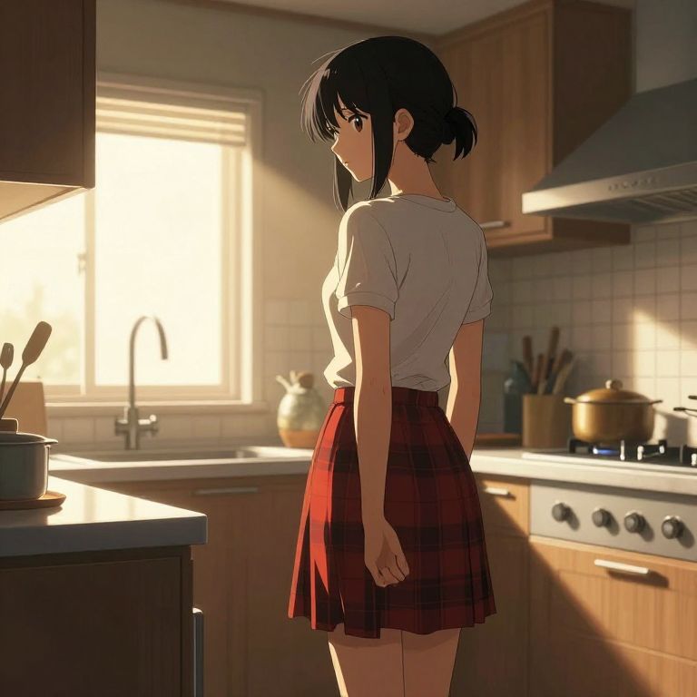 Anime-style digital drawing of a young woman with black hair in a ponytail, wearing a white shirt and red skirt, standing in a sunlit kitchen