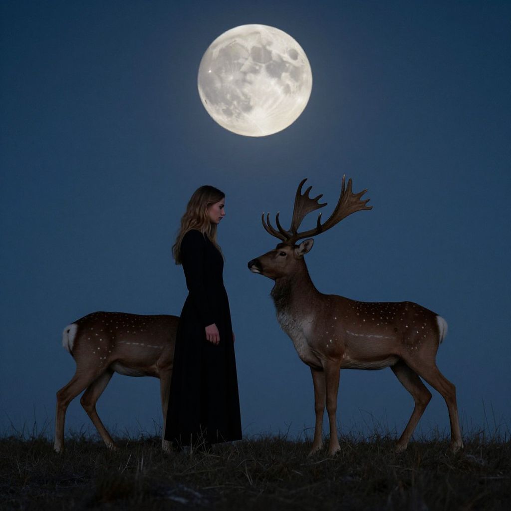 Moonlit Communion of Woman and Stag