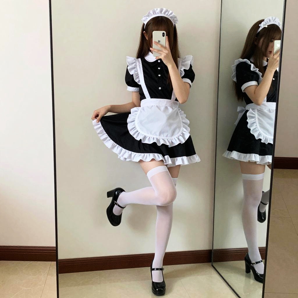 Photograph of a woman in a black and white French maid outfit, white thigh-high stockings, black Mary Jane shoes, posing in front of a mirror