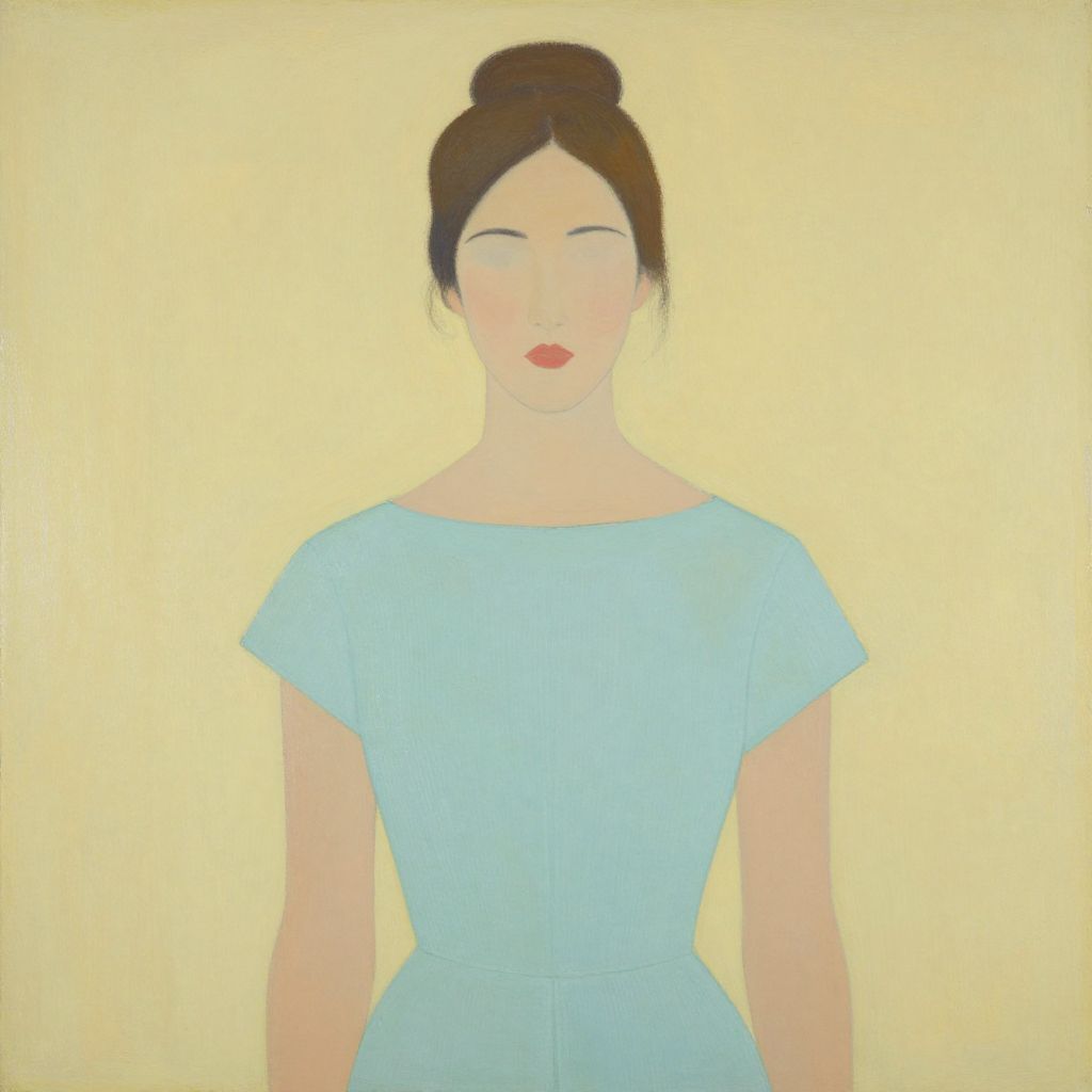 A serene portrait by Alex Katz, featuring a woman in a light teal dress against a soft yellow background, exemplifies his signature style of flat color fields and minimalistic composition, showcased at the Serpentine Gallery in London.
