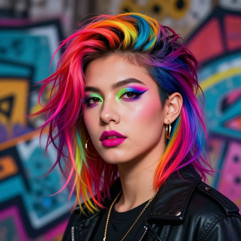 Ritratto of a modern young person with vibrant colorful hair and bold makeup, urban background with graffiti walls, coming-of-age vibe, high contrast lighting with neon accents, dynamic and edgy digital art style, blending realism with stylized elements