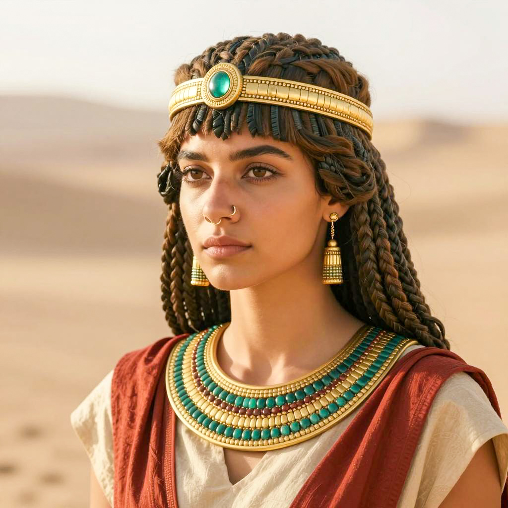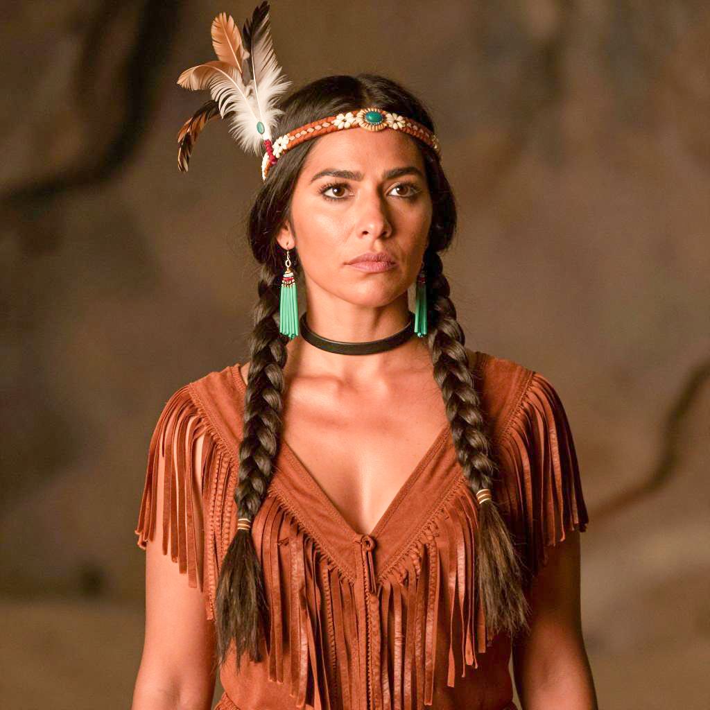 Native american temptress, photograph of a woman, Native American style, wearing a feathered headband, brown fringe dress with deep V-neck, long braids, choker necklace, green earrings, standing in dimly lit background, serious expression, natural light, medium close-up, realistic style, cinematic feel, actress, detailed ures, warm colors, dark background elements, Native American costume