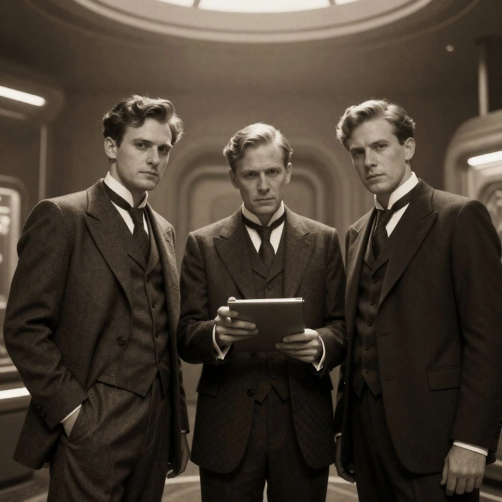 Realistic photo.Time travelers plotting alteration of history in a retro-futuristic, sepia tones. Rendered with an ominous, futuristic atmosphere. realistic photo