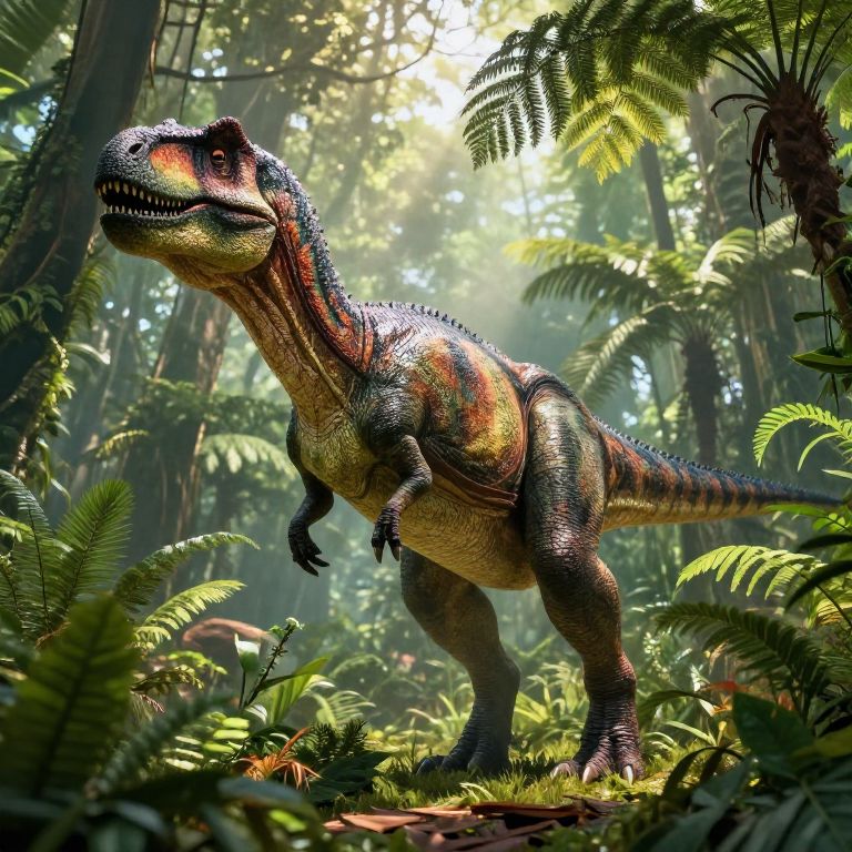 Photo of dinosaur captured in a vibrant prehistoric jungle, detailed scales glistening under sun rays, towering ferns around, mist rising, realistic textures and shadows, evoking a sense of awe and ancient wilderness.