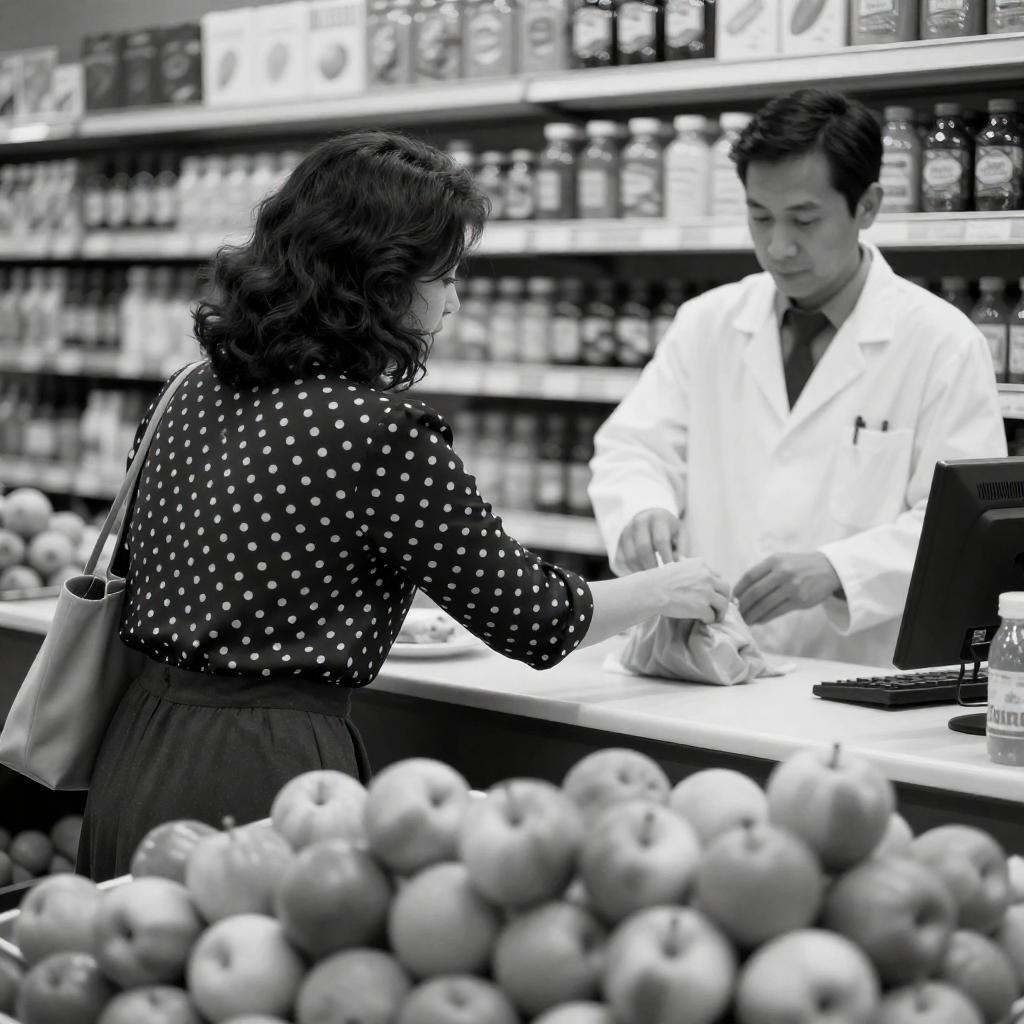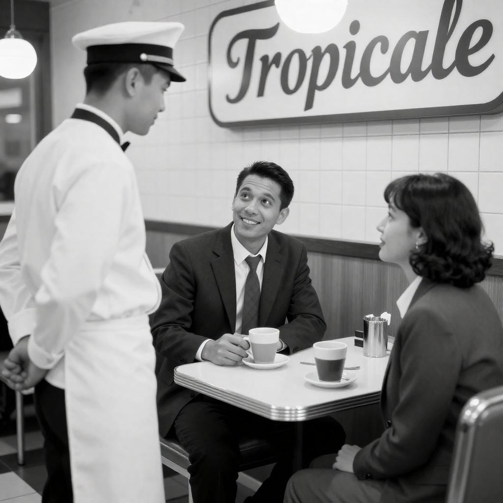 Black and white photo of a male waiter in a white uniform and hat standing by a table in a diner. Seated at the table are a man and a woman, both dressed formally, the man in a dark suit holding a coffee cup and smiling, the woman in a dark blazer and white blouse looking at him. The background features tiled walls and a sign reading 'Tropicale'.