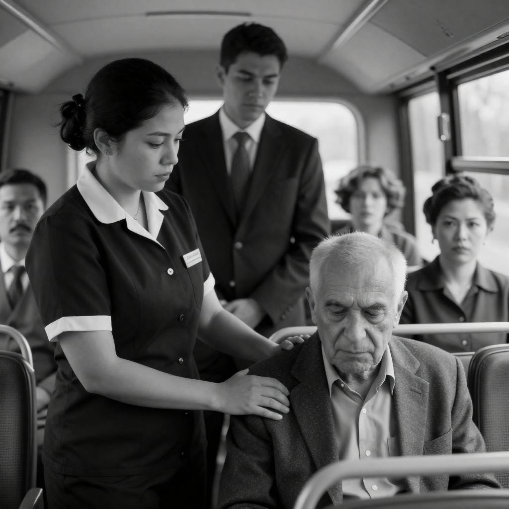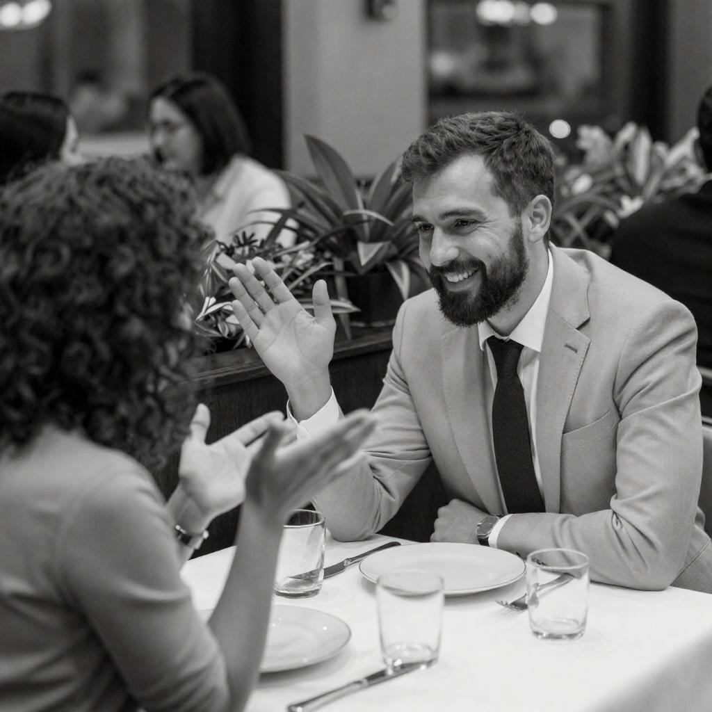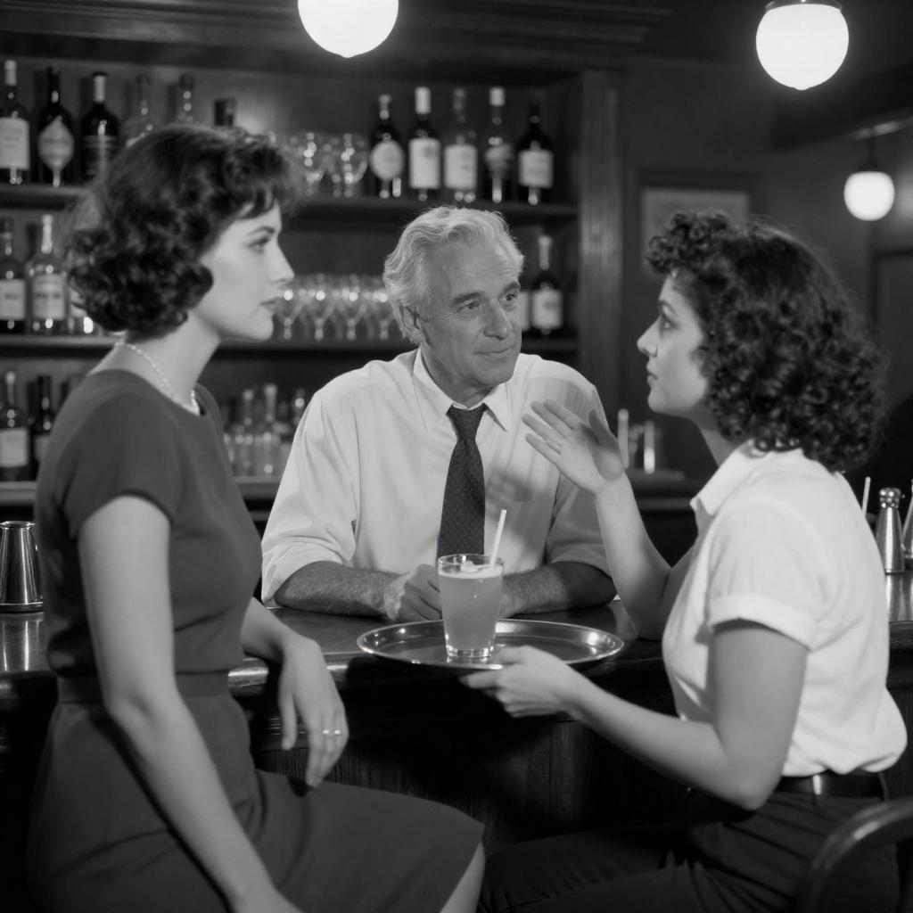 Black and white photograph of three people in a diner. A male waiter in a white uniform with a hat stands left, facing two seated people. The man in the center wears a dark suit and holds a coffee cup, smiling. The woman on the right, in a dark blazer and white blouse, looks at the man. Background has tiled walls and "Tropicale" sign.