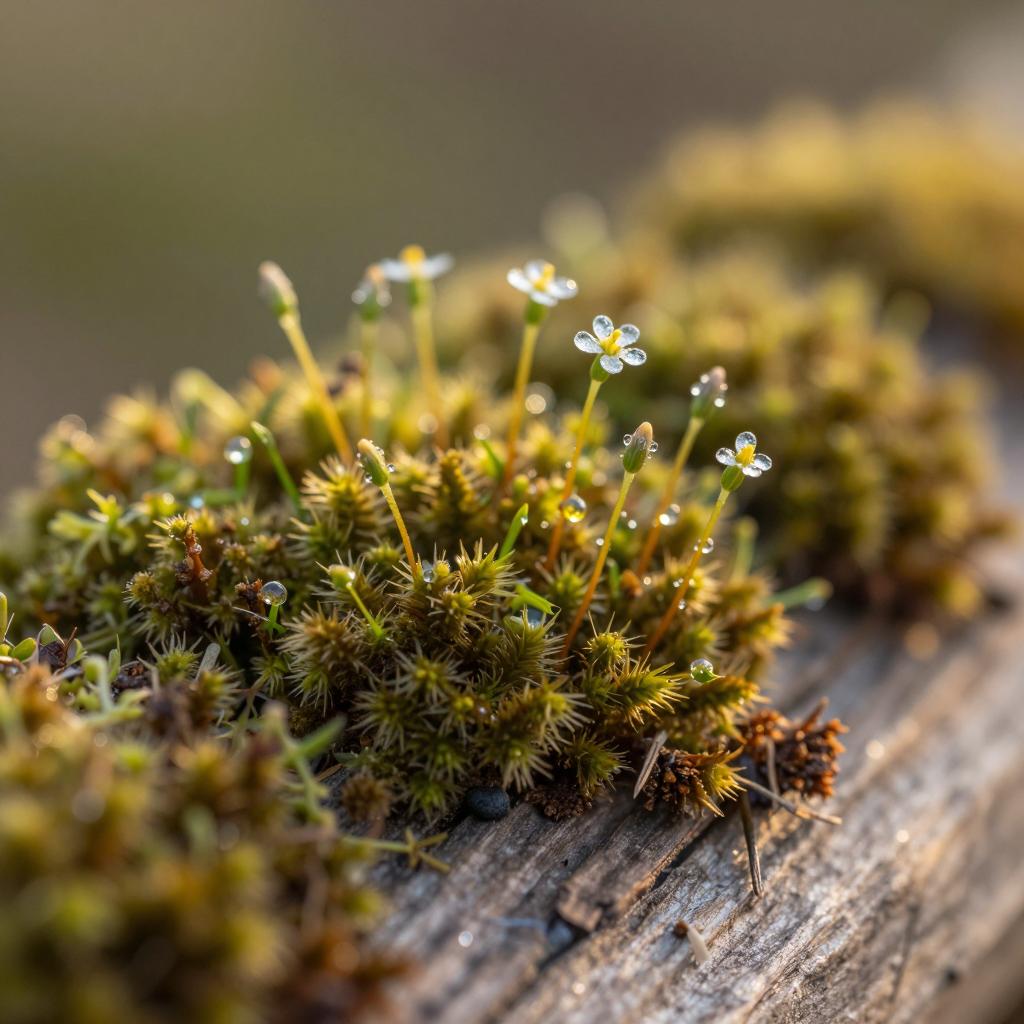 Macro close-up of dewy green moss and tiny wildflowers on rough wooden bark under golden hour sunlight, 8K resolution, minimalistic, bright, authentic, healthy, vibrant, photorealistic.