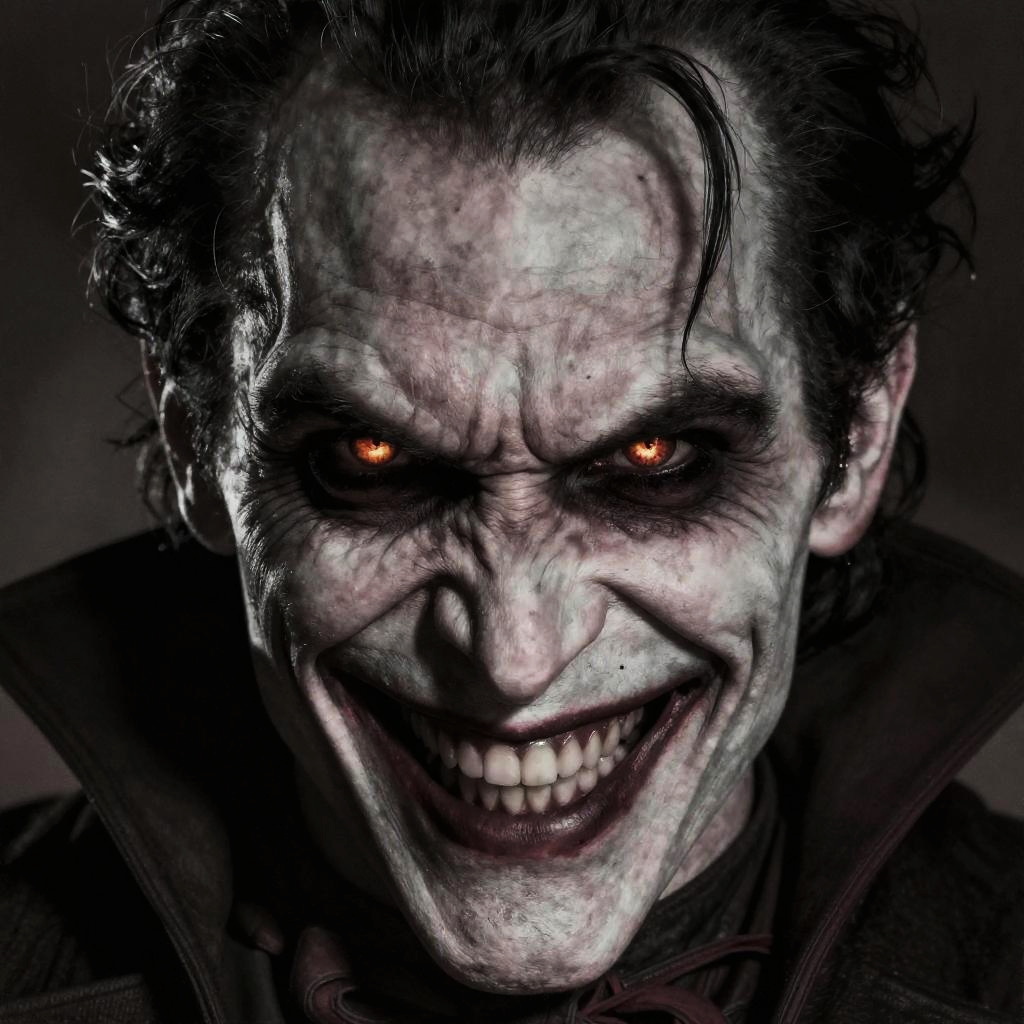 Realistic evil face drawing of a sinister villain with deep wrinkles, piercing glowing eyes, and a menacing grin, dark shadows emphasizing the sharp cheekbones, photorealistic style with meticulous detail, eerie atmosphere, chiaroscuro lighting.