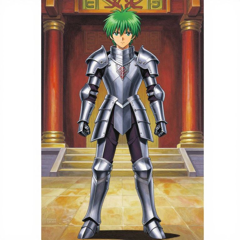 Anime-style drawing of a white-haired knight in armor sitting on a bench, while a bearded Jesus in a white robe touches his forehead. Gothic cathedral