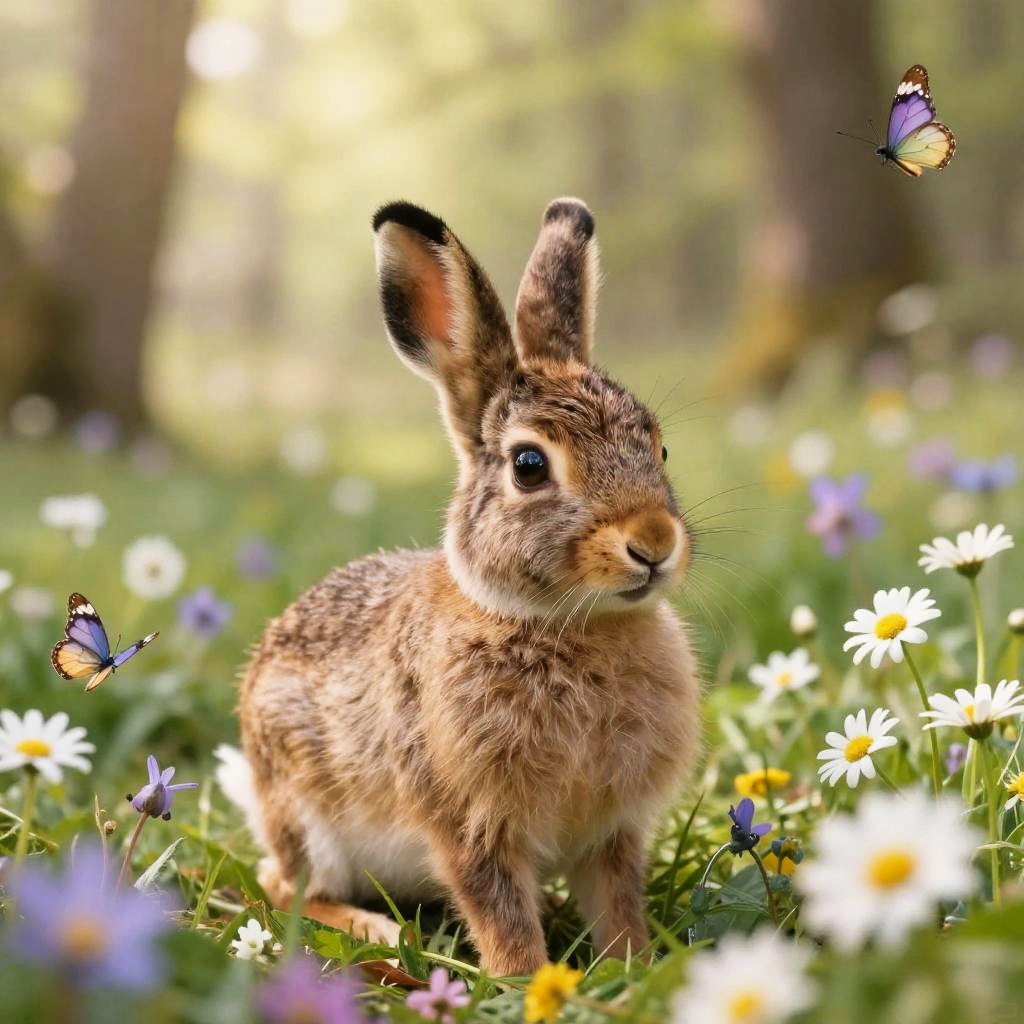 Babyhase nestled in a field of spring flowers, soft pastel colors, sunlight filtering through trees, dreamy and gentle atmosphere, delicate fur texture visible, woodland scene with blooming daisies and butterflies, whimsical and heartwarming mood
