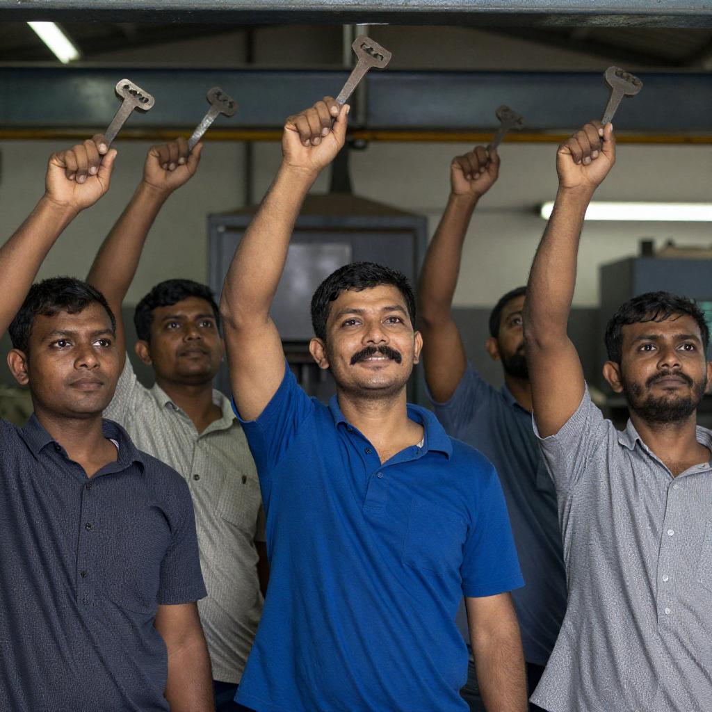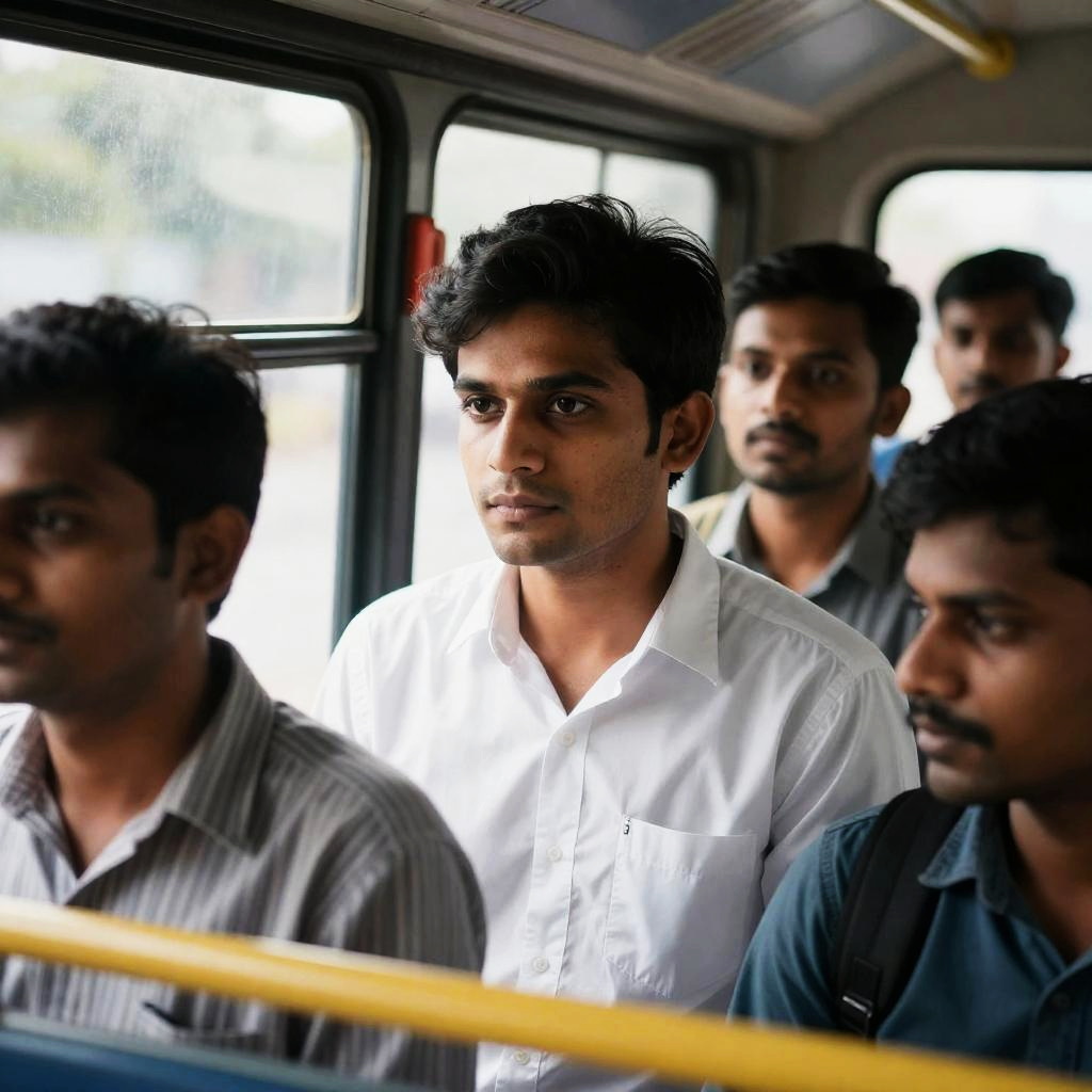 Medium-shot photograph of a serious-looking Indian man with short black hair, wearing a green t-shirt with a black hat graphic, standing beside a snack stall with colorful bags and a graffiti-covered wall. Blurred background includes a person in a blue shirt and another person shirtless. Bright outdoor setting with partial structure visible.