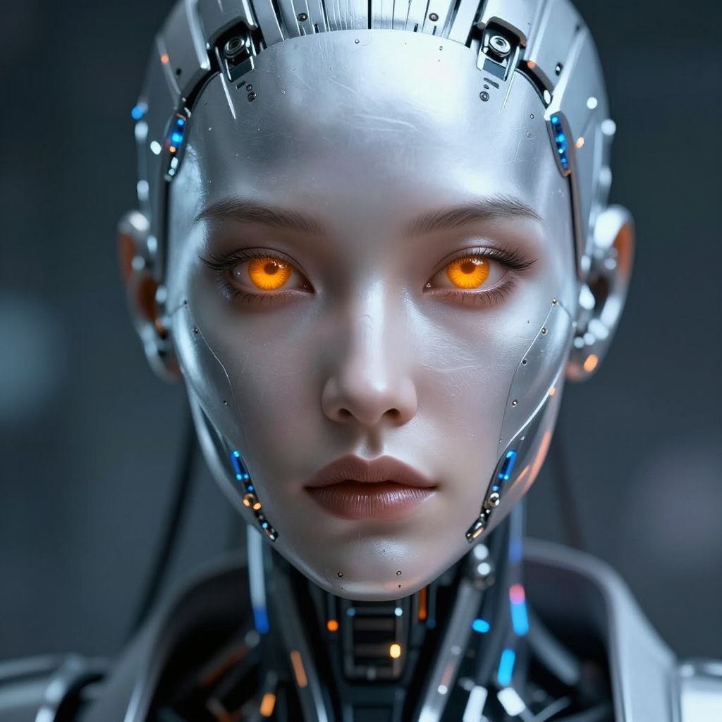 Close-up portrait of a cyberpunk female android with metallic silver skin and glowing amber eyes. The android features intricate mechanical components integrated seamlessly with human-like facial features, highlighted with blue and orange LED lights. The background is blurred, emphasizing the futuristic technology and hyperrealistic detail of the android's design.
