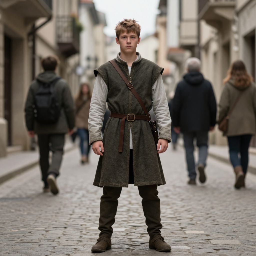 Man Character, boy in medieval costume standing in a narrow street with people walking by