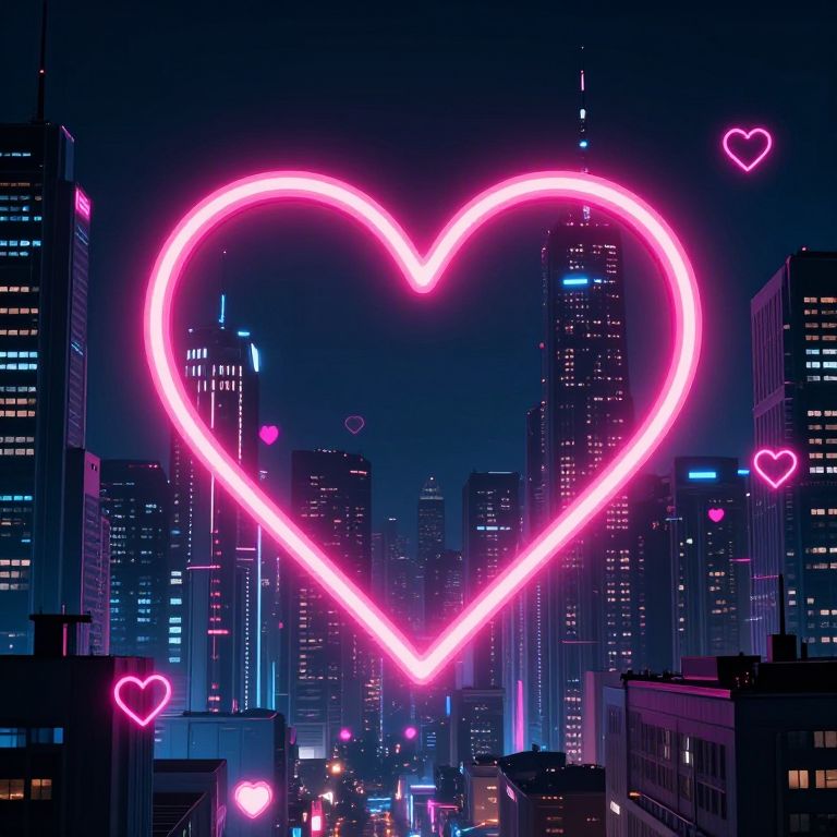 Neon pink heart outline glows over a dark, vibrant city skyline with blue and purple skyscraper lights, surrounded by smaller pink hearts. Photographic