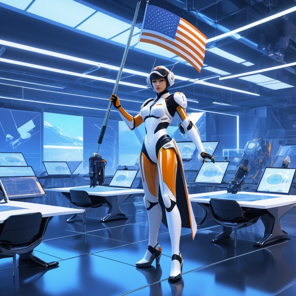 3D rendered image of a female cyborg in a white and black high-tech suit standing confidently in a futuristic technology laboratory. She is holding and waving the American flag. The lab is equipped with glowing digital screens, holographic interfaces, and other humanoid robots in the background. The scene emphasizes advanced robotics and cybernetic themes with a blue-toned high-tech environment.