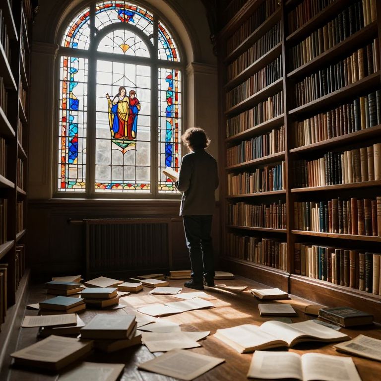 Photograph of a dimly lit library with a single person standing with their back to the camera, silhouetted by sunlight streaming through a large, colorful stained glass window. The window depicts a religious scene with vibrant reds, blues, and yellows. The person has curly hair and wears a dark shirt and blue jeans. The room is filled with tall, wooden bookshelves on both sides, packed with books. Sunlight creates a pattern of light and shadow on the floor, which is scattered with open and closed books. The overall atmosphere is serene and contemplative.