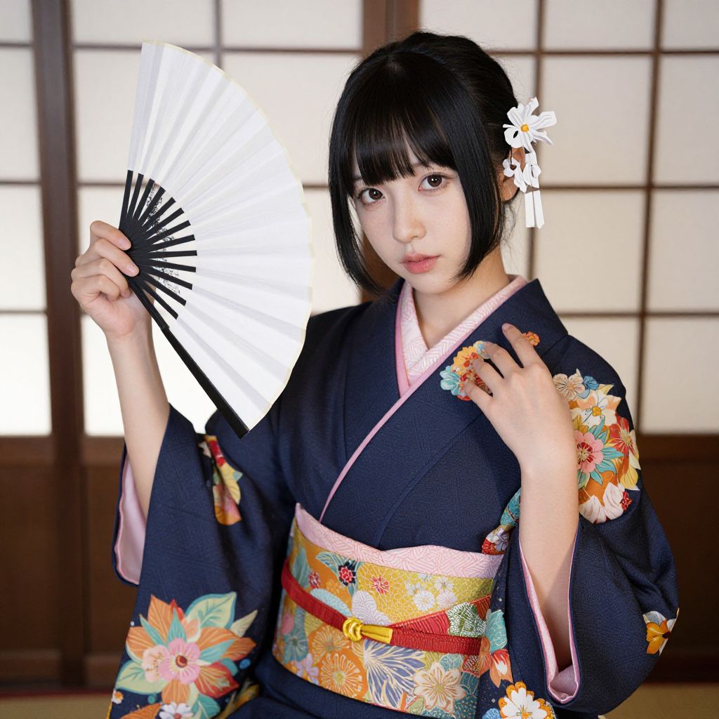 Photograph of an Asian woman with fair skin and straight black hair, wearing a traditional navy blue kimono adorned with colorful floral patterns on the sleeves and obi. She holds a black fan in her right hand and a white umbrella in her left. Her hair is styled with a white flower accessory. The background features a shoji screen with wooden frames. The woman's expression is neutral, and she stands in a traditional Japanese setting. The lighting is bright, highlighting the textures and colors of her kimono.