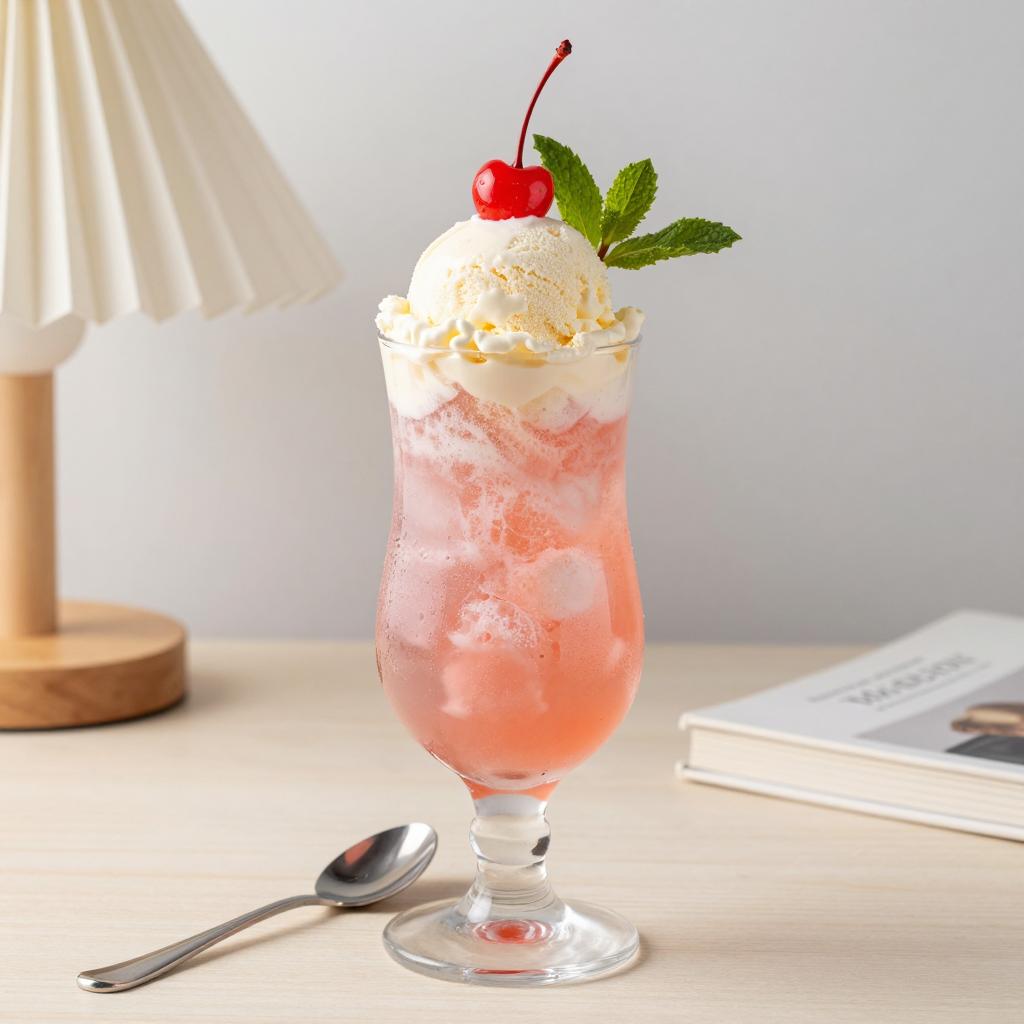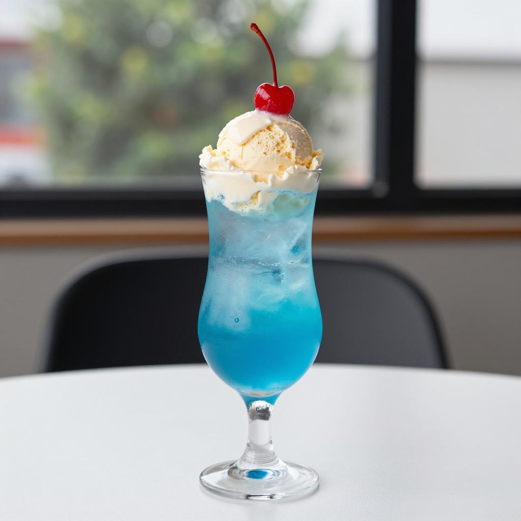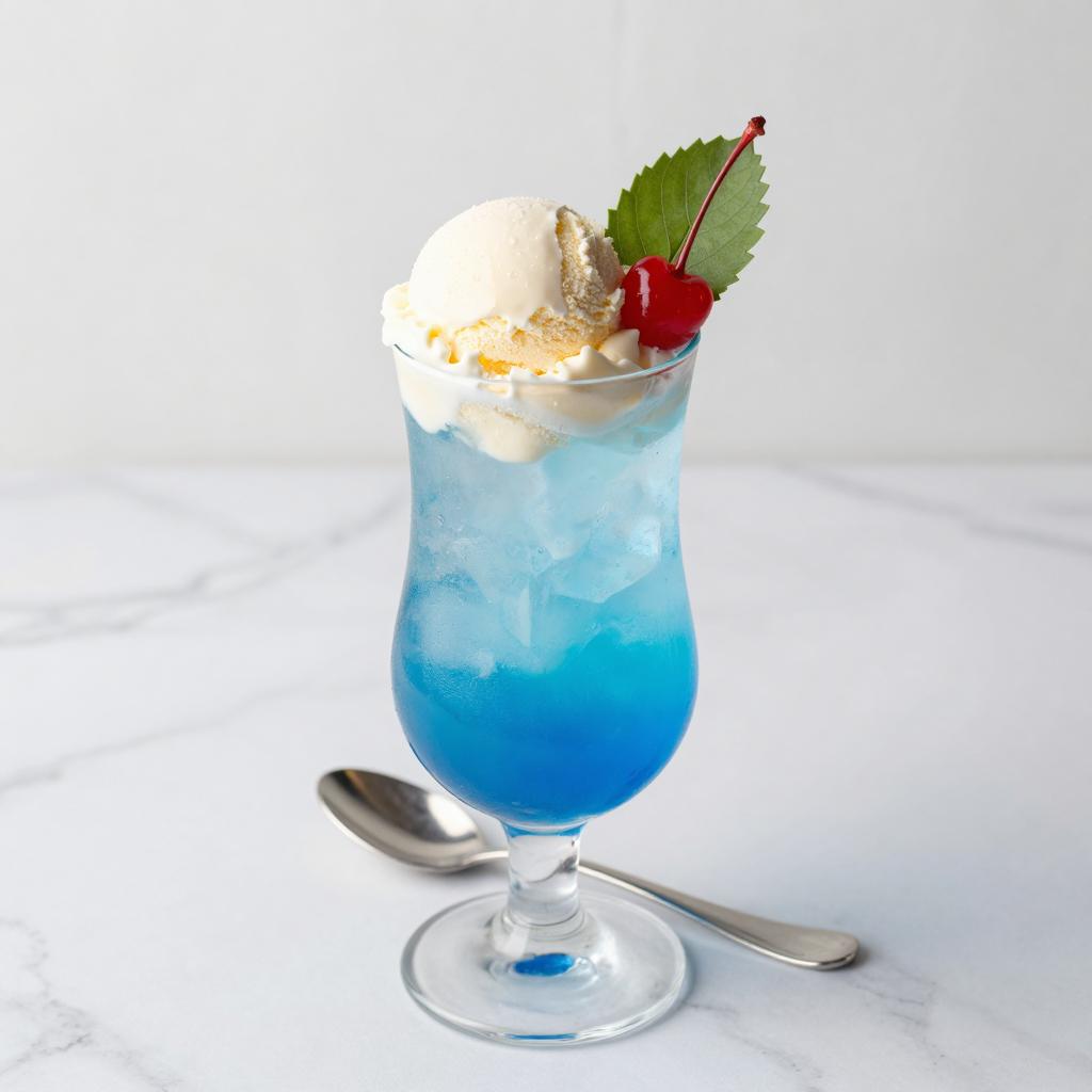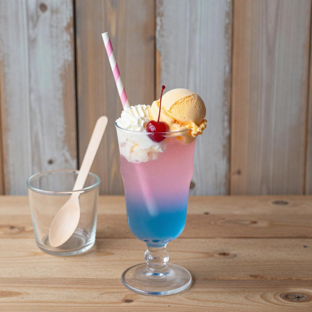 Glass cup with a gradient of purple, pink, and blue colors, filled with a frozen drink. A large scoop of white ice cream and a small orange cherry on top. On a blue table, with a blurred brown and blue background.