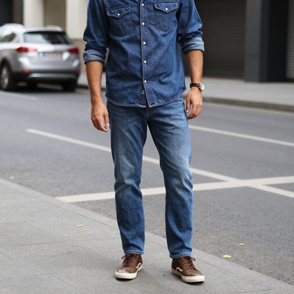 Man Fashion Jeans, man in a denim shirt and jeans standing on a street corner