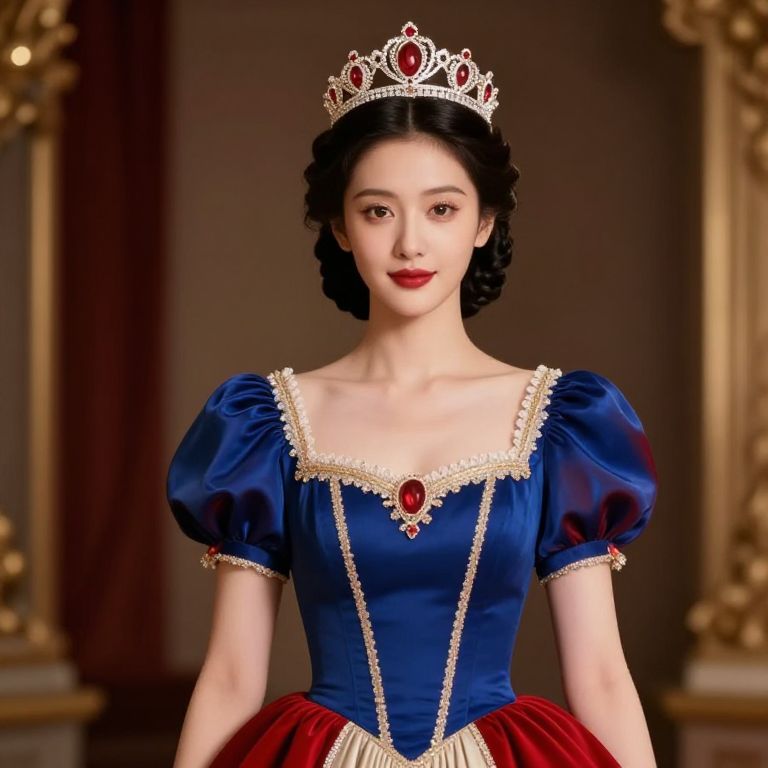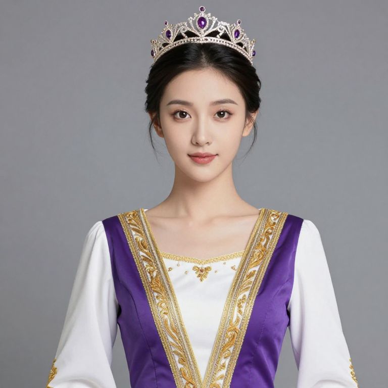 Female, ornate, purple, gold, and white outfit with a crown on her head.