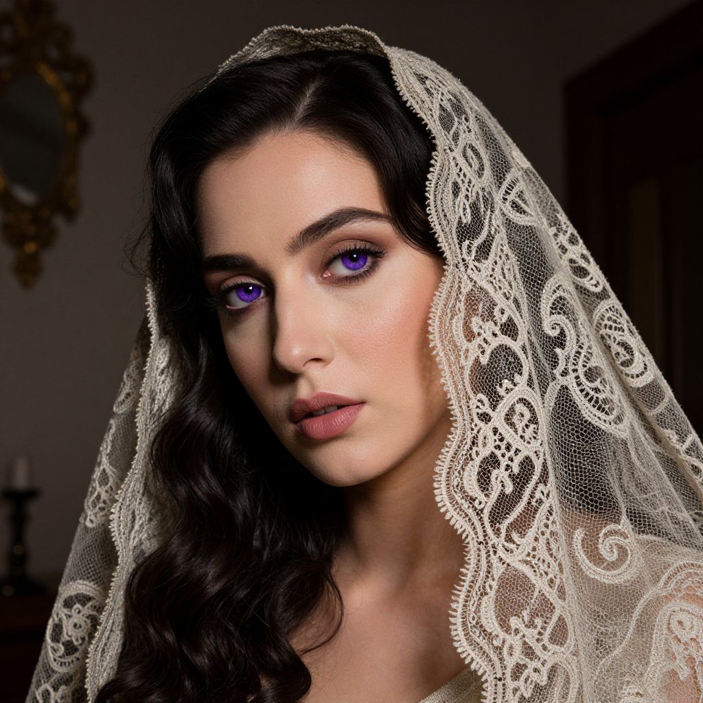 A close-up portrait of an enigmatic Middle Eastern woman with porcelain skin and captivating violet eyes exudes mystery and allure from a low angle. Her long raven hair falls in gentle waves over one shoulder, while a delicate lace veil softly drapes across her face, revealing glimpses of her enchanting gaze. The image, reminiscent of vintage photography with shallow depth of field, highlights the intricate details of her flawless complexion through subtle light and shadow play on her skin. This super-realistic portrait is enhanced by the dimly lit room with antique furnishings, adding an air of intrigue and timeless elegance.
