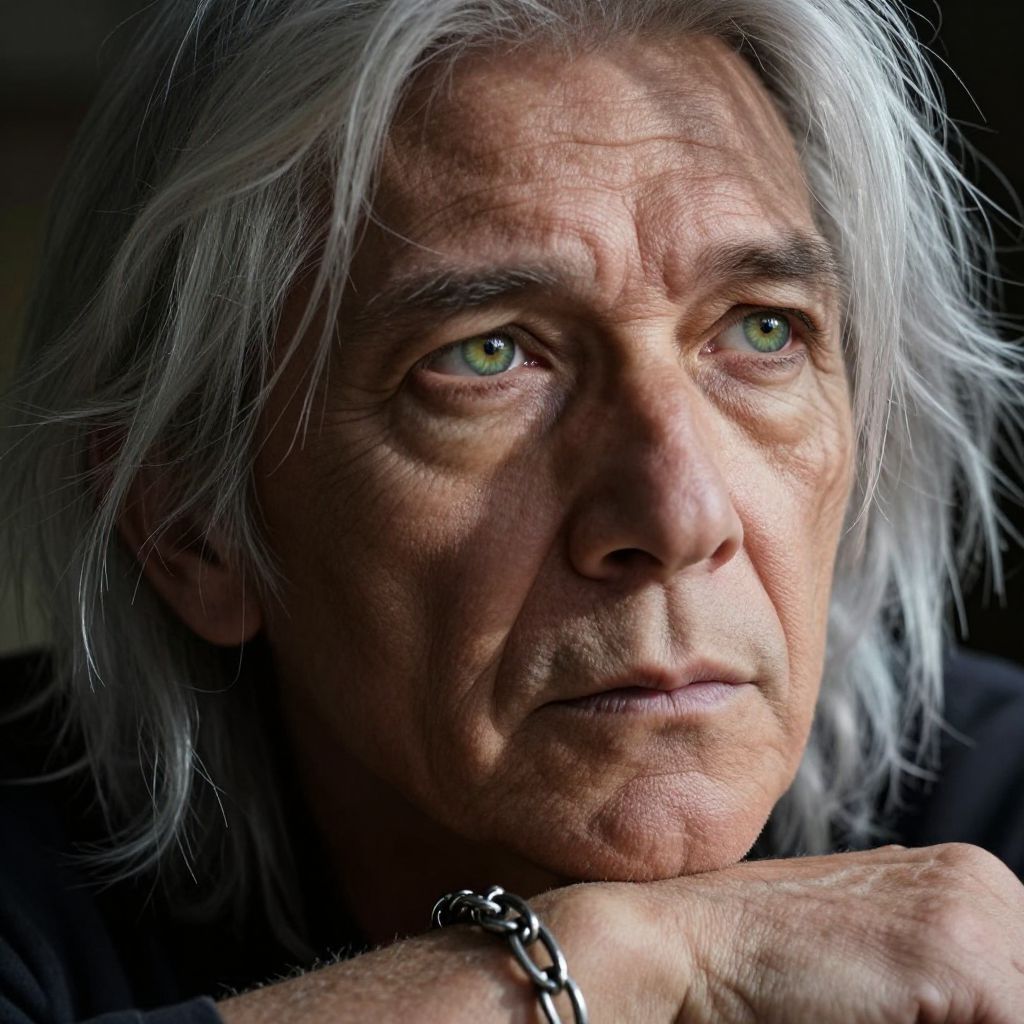 Super-realistic portrait of an artist with kind green eyes and tousled silver hair, captured in a dramatic close-up as they gaze intensely into the distance. The unique lighting casts intricate shadows on their weathered face, revealing fine lines and sun-creased skin texture while illuminating a coarse chain bracelet around their wrist. This image conveys both the depth of their creative soul and passage of time, evoking awe at the human experience reflected in their expression—a masterful blend of artistry and life's intricacies captured through an unconventional 'bug's-eye view' perspective.
