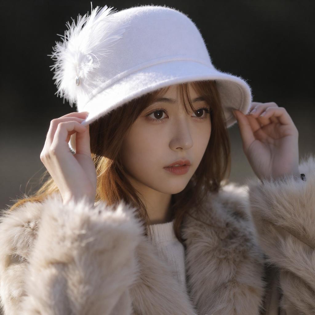 Photograph of a young woman with light brown hair, wearing a white feathered hat and a fur-trimmed coat, holding the hat with both hands. She has a focused expression, with soft, warm light illuminating her face and creating a dramatic contrast against the dark background.
