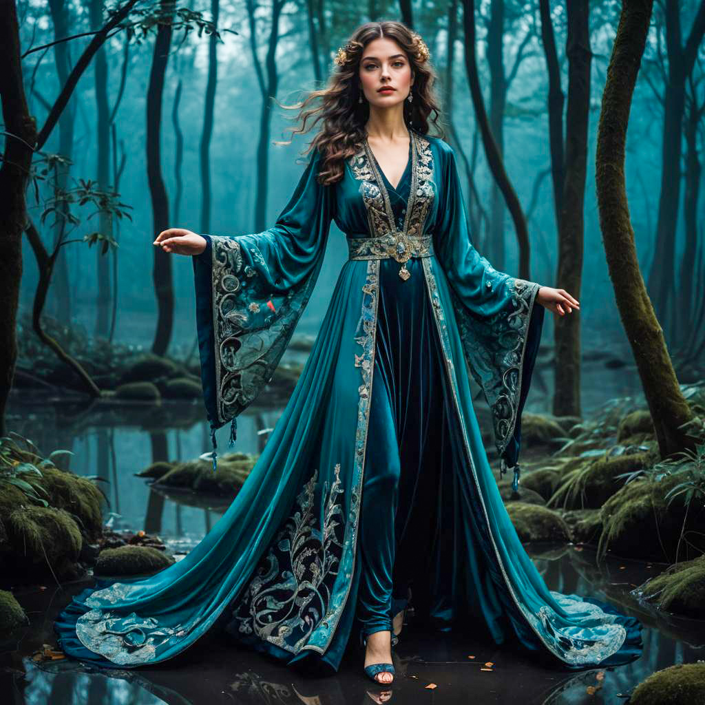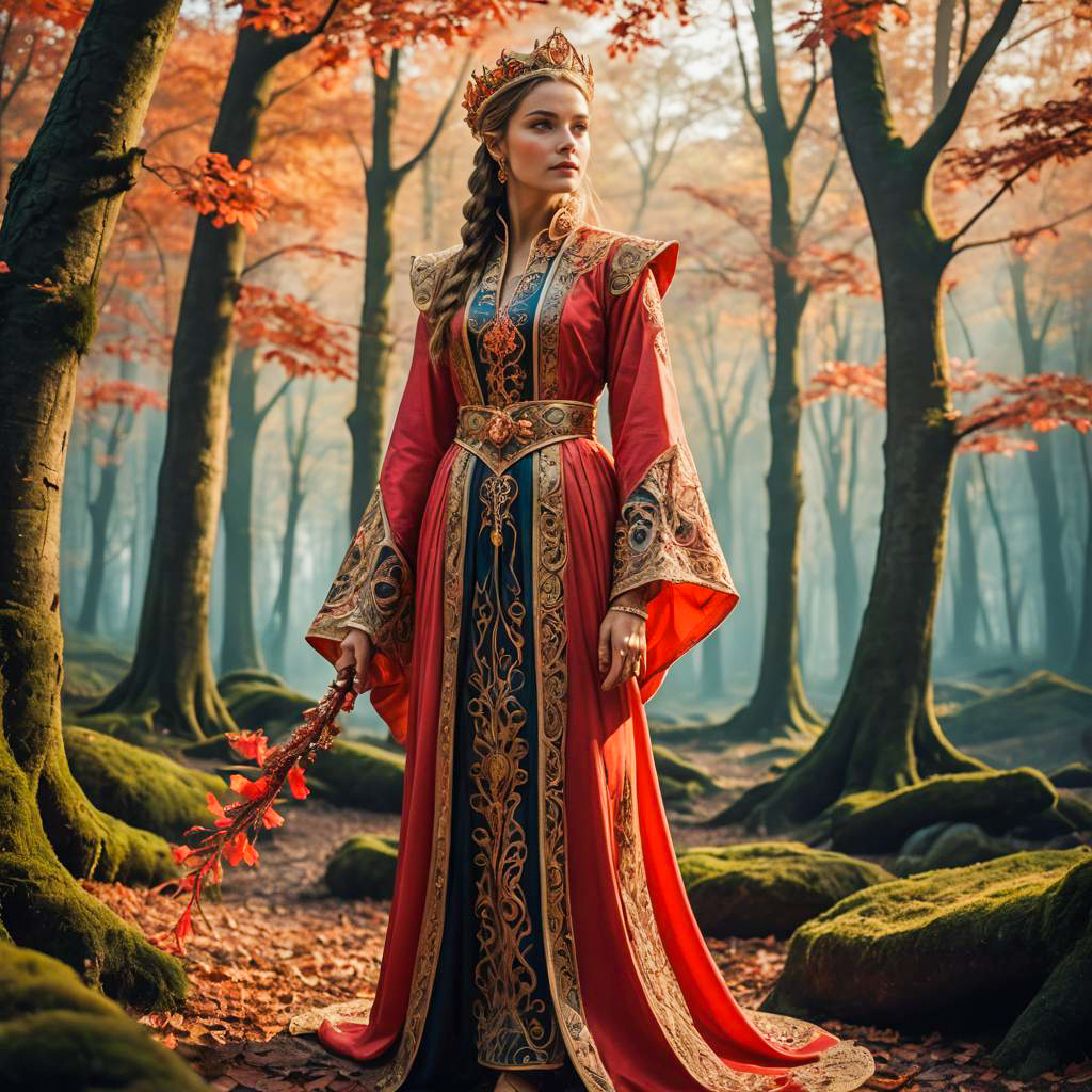 Curvy woman with long wavy hair wearing an elegant terracotta orange medieval-style robe with gold trim and ornate details. The flowing fabric and long sleeves complement the mystical aura as she stands on a mountain overlook during sunset, with a vast mountainous landscape and a castle in the background.