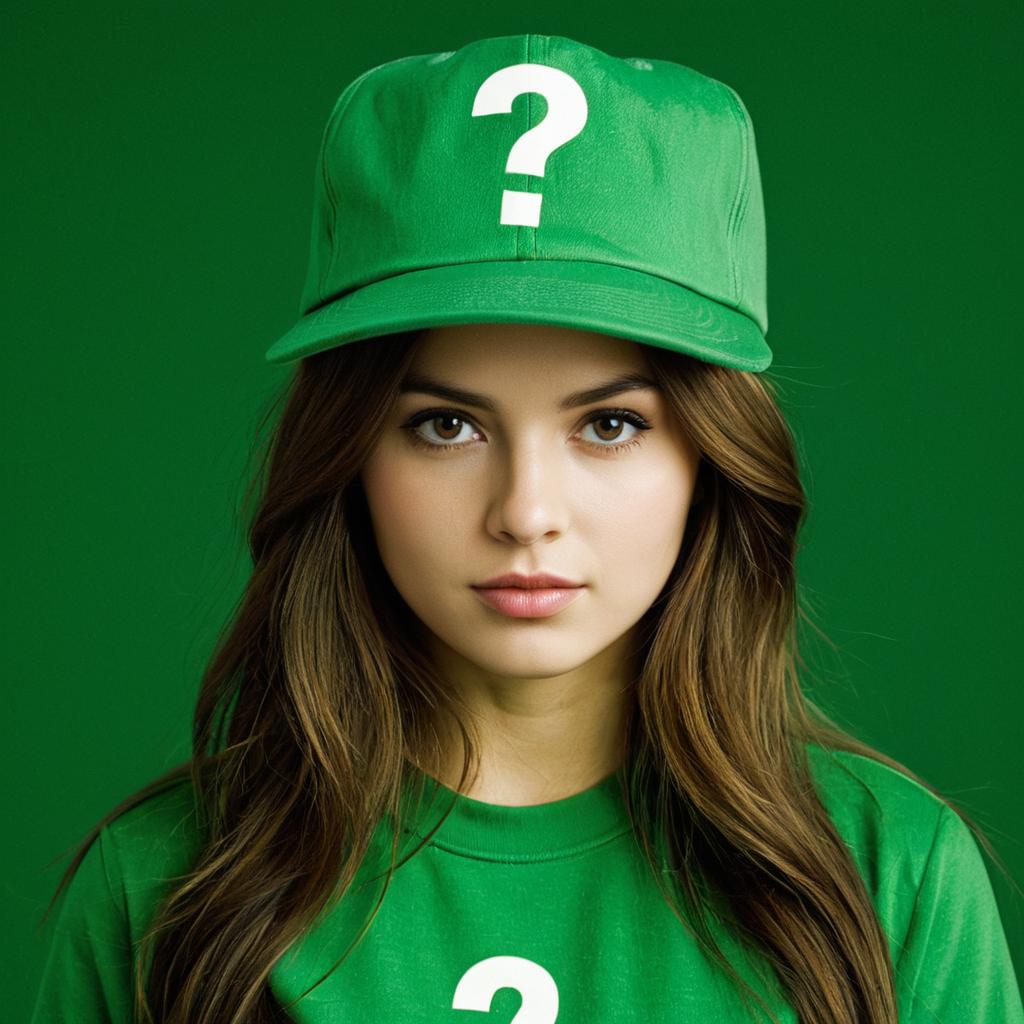 Green costume question marks,1girl, solo, brown hair, long hair, green shirt, ?, realistic, green headwear, looking at viewer, shirt, hat, upper body