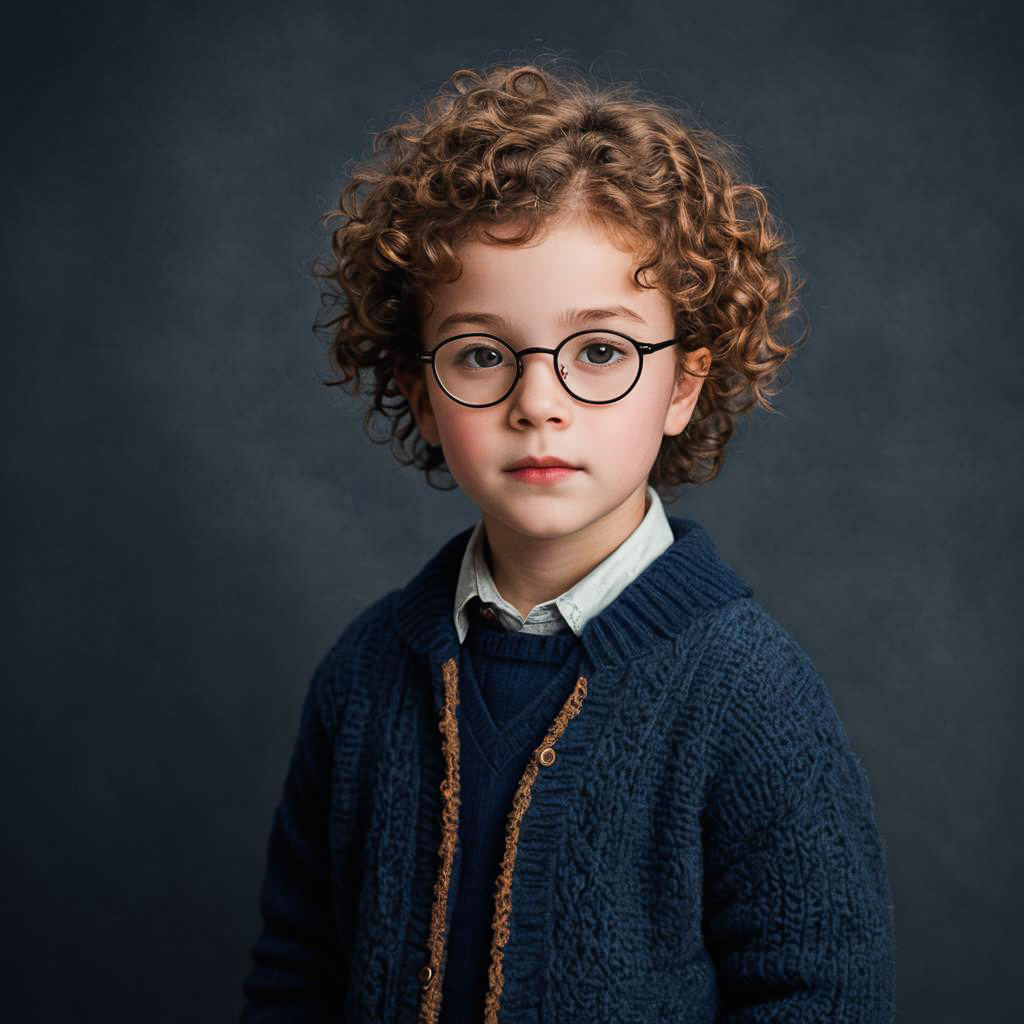 Photo-shoot, awed child with glasses, curly chestnut hair, small frame, harry potter outfit, cozy sweater, enchanting. Muted slate to navy studio background
