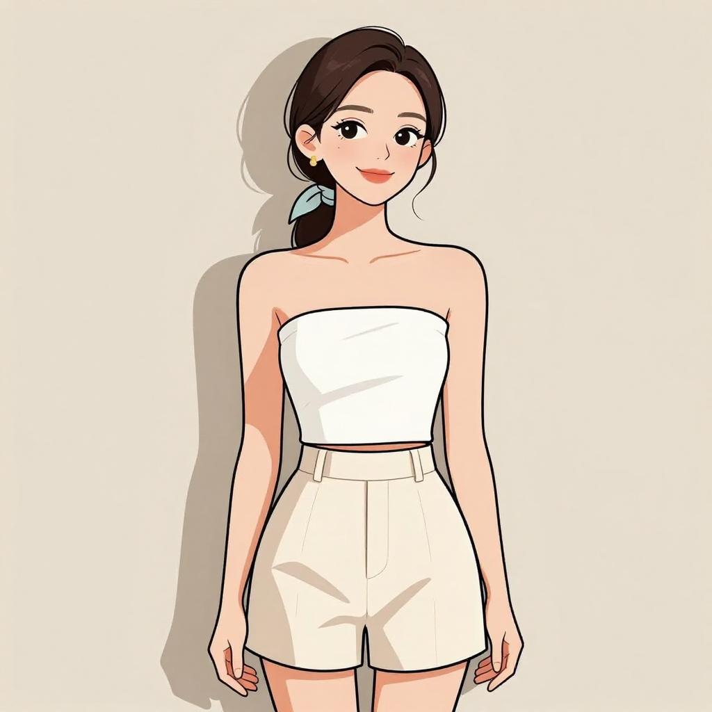 Digital illustration of an attractive Asian woman with black hair in a ponytail, wearing a white strapless top and high-waisted shorts, smiling against