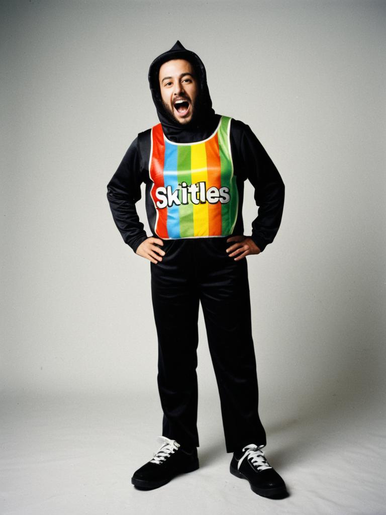 Person in Skittles Costume, photorealistic humorous studio portrait