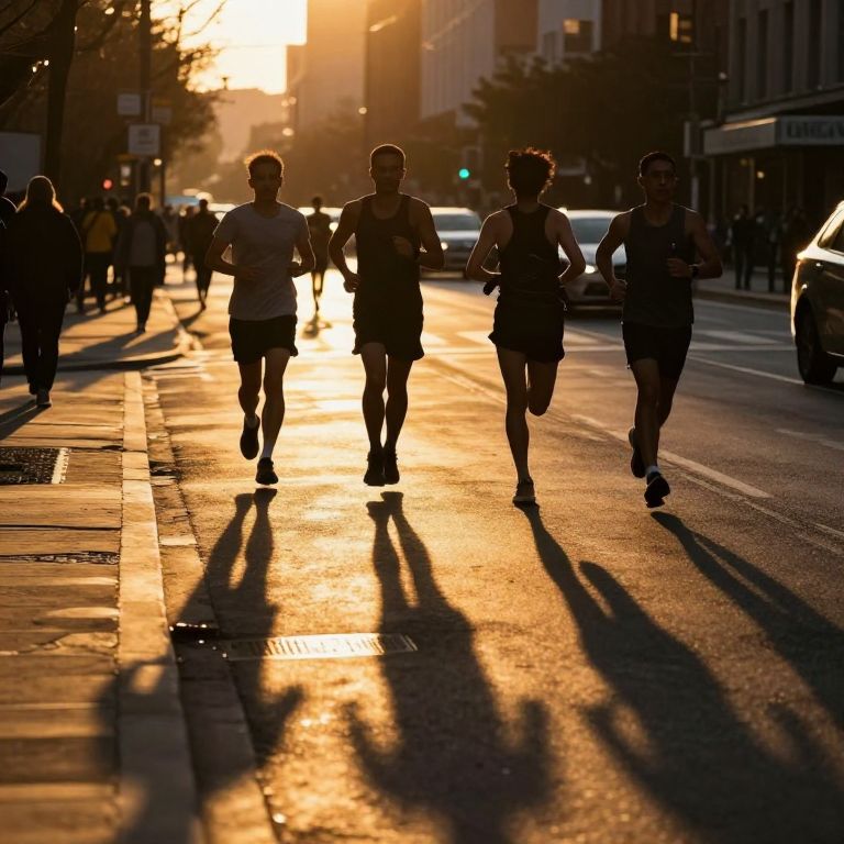 A high-definition digital rendering captures the bustling energy of a cityscape at golden hour, where silhouetted figures run along a sunlit street, their elongated shadows racing ahead in a dynamic interplay of light and movement, evoking the surreal and cinematic atmosphere of cyberpunk aesthetics.
