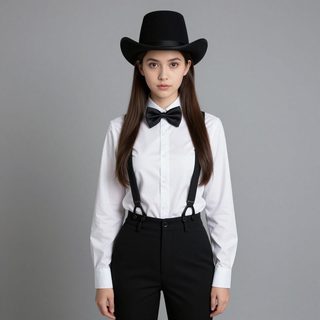 Photograph of a young Asian woman standing against a plain gray background. She has long, straight black hair and wears a black wide-brimmed hat, white long-sleeve dress shirt, black bow tie, and black high-waisted trousers with suspenders. Her expression is neutral, and she is centered in the frame, facing the camera. The overall style is formal and vintage, with a minimalist and clean look. The lighting is even, highlighting the contrast between her white shirt and black accessories.