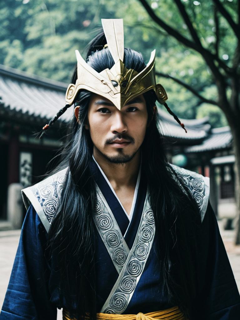 Man in Asian Long Hair costume, cosplay editorial portrait, cinematic realism