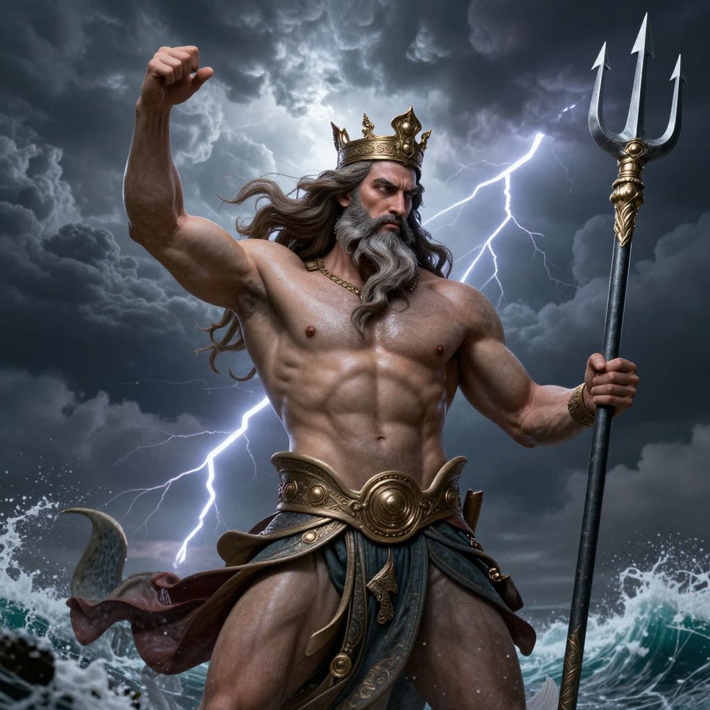 The image depicts a highly detailed and realistic portrayal of Poseidon, the god of the sea, storms, earthquakes, and horses. The central figure is a muscular, bearded man with long, flowing hair and a crown adorned with intricate designs. His expression is stern and powerful, with a sense of authority and control over the elements. Poseidon is depicted in a dynamic pose, with one hand raised and the other holding a trident, symbolizing his power over the sea. The background features a dramatic, stormy sky with dark clouds and lightning bolts, enhancing the sense of power and chaos associated with Poseidon. The overall composition is balanced, with the figure of Poseidon centrally positioned and the elements of the storm arranged around him, creating a sense of depth and movement. The interplay of light and shadow, as well as the intricate details in the textures of the hair, skin, and crown, add to the realism and visual richness of the image.