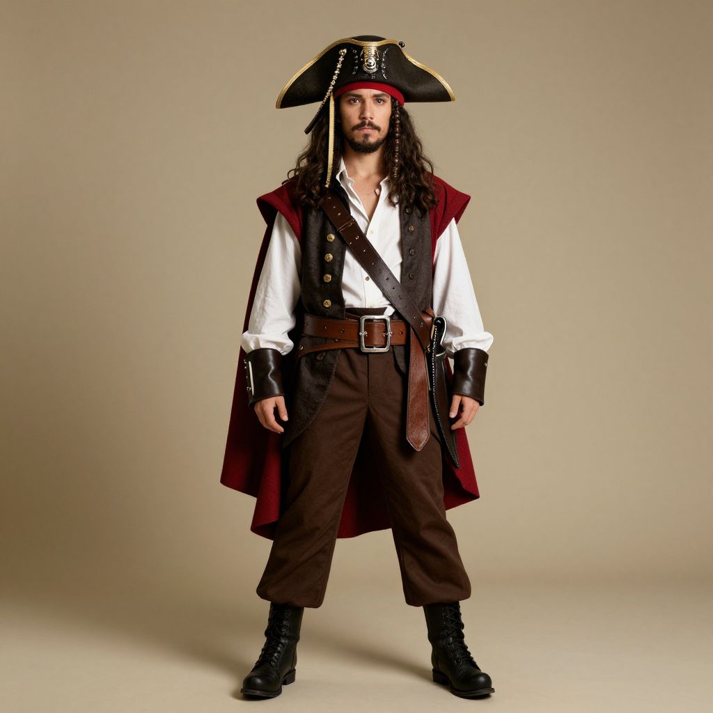 Pirate Costume Aesthetic, pirate in a brown outfit with a red cape and a hat