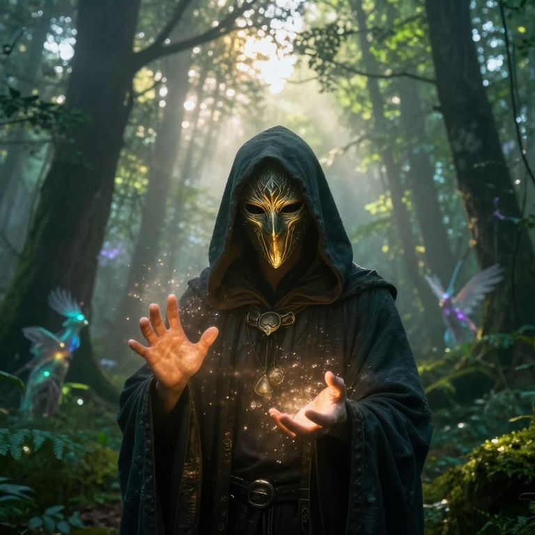 Mysterious hooded figure with glowing mask and outstretched hands conjures sparks in a sunlit, enchanted forest, surrounded by ethereal creatures.