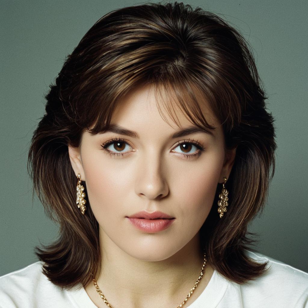 Photorealistic portrait of a young woman with brown mullet haircut, wearing gold earrings and a matching necklace. She has light makeup with natural lips and brown eyes, dressed in a white shirt, looking directly at the viewer against a plain background.