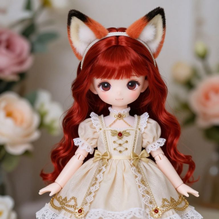 Exquisite doll with vibrant red hair adorned in a delicate cream dress featuring gold accents, lace details, and a charming fox-ear headband, set against a floral backdrop.