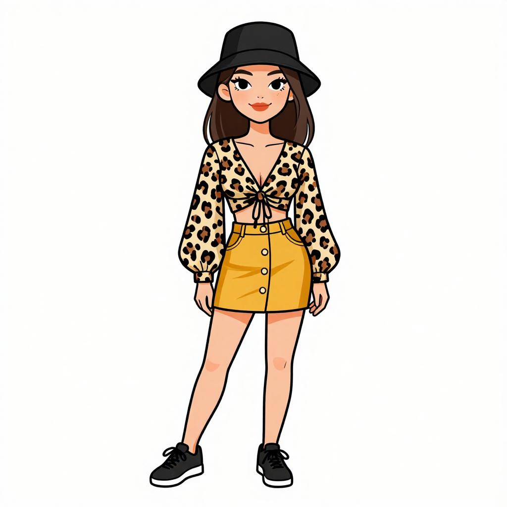 Digital illustration of a young woman with light skin and black hair, wearing a black bucket hat. She has large black eyes and red lips. Her outfit includes a tied, long-sleeved, leopard-print blouse and a high-waisted, yellow button-up skirt. She also wears black sneakers with white soles. The background is plain white, making her colorful attire stand out. The style is cartoonish with bold, solid colors and simple shading, emphasizing a modern, trendy fashion look. The woman stands with a slight smile and relaxed posture.