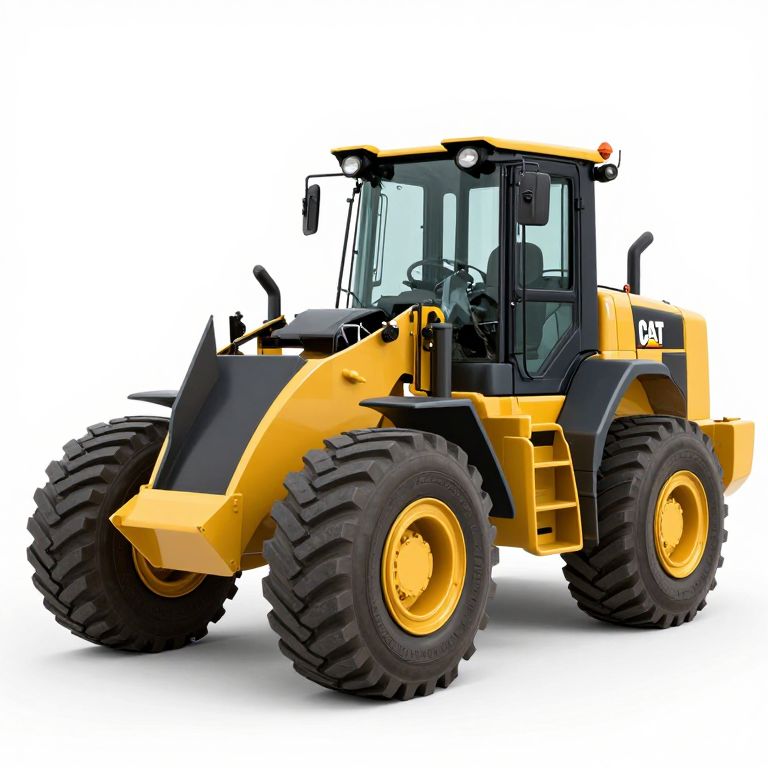 A high-definition 3D render of a Caterpillar wheel loader, showcasing detailed textures and realistic lighting effects, captures the robust industrial design and iconic yellow-and-black color scheme against a clean white background.