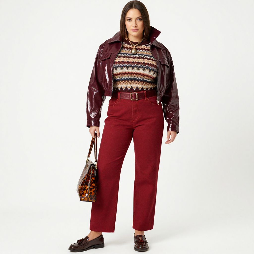 "Woman, retro-inspired, cropped burgundy vinyl jacket with pointed collar and flap pockets, geometric patterned knit sweater in earth tones with a scalloped hem, high-waisted straight-leg red denim trousers with matching belt, brown leather loafers with tassels, metallic pendant necklace, tortoiseshell print handbag, white background with studio lighting.. Sexy. Pretty face and beаutiful eyes. Big breasts."