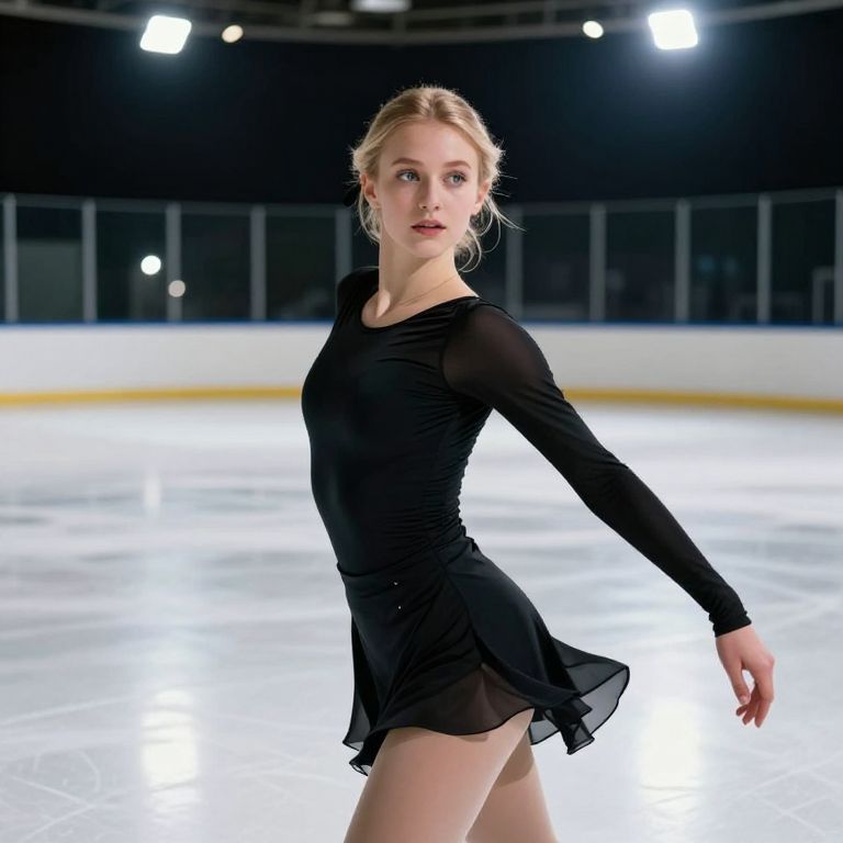 A stunning realistic portrait of a figure skater in a form-fitting black figure skating dress during a nighttime practice session on a large indoor ice rink; she has a slender build, soft blonde hair swept to one side, and expressive green eyes; the lighting is dramatic with overhead spotlights, emphasizing the texture of the dress as it moves with her motion, with reflections of ice in the glass walls.