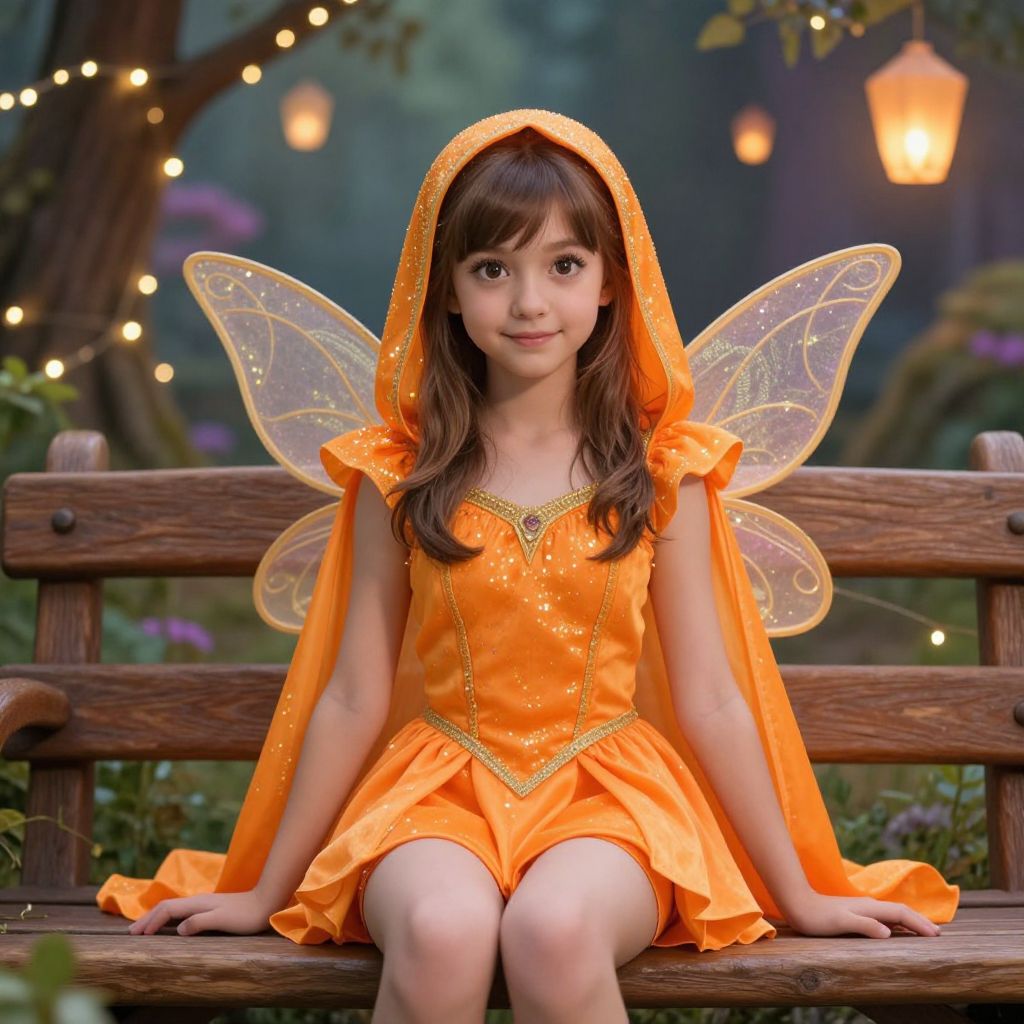 Photograph of a young girl with fair skin and brown hair, sitting on a wooden bench in a magical forest setting. She wears an orange dress with a matching hood, adorned with sparkling embellishments and delicate, translucent fairy wings. Her large brown eyes and gentle smile convey a sense of innocence. The background features blurred, softly glowing lanterns and lush greenery, adding a whimsical, enchanting atmosphere. The wooden bench has a rustic texture, complementing the fairy-tale theme. The overall image has a warm, fairy-tale aesthetic, enhanced by soft lighting and gentle bokeh effects.