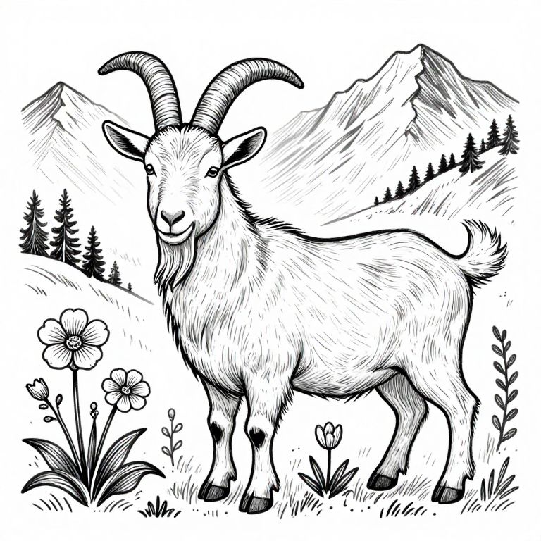 A detailed, black-and-white line drawing of a goat with a horn, set against a mountainous landscape with flowers and foliage, reminiscent of scandinavian folk art.
