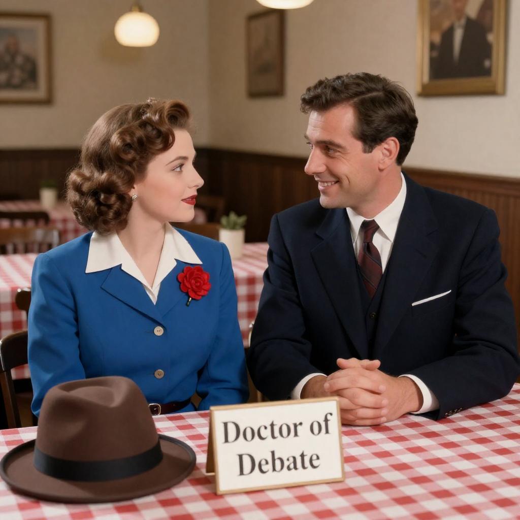 A vintage-style photograph featuring a man and woman seated at a table in a restaurant. The man wears a dark suit with a tie and the woman is dressed in a blue suit jacket with a white collar and a red flower pin. They sit at a table with a red and white checkered tablecloth, next to a brown fedora hat. A sign in front of them reads 'Doctor of Debate.' The woman is looking at the man who is smiling back at her. The setting includes wooden paneling and framed pictures on the wall.
