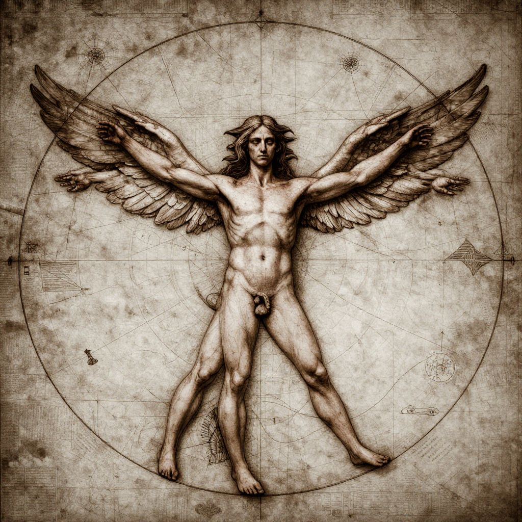 The image depicts a striking and unsettling depiction of a humanoid figure with wings, reminiscent of Leonardo da Vinci's Vitruvian Man, but with a dark, horror-inspired twist. The figure is centrally positioned within a circular framework, with its arms and legs extended outward, creating a symmetrical and balanced composition. The wings, detailed with intricate feather patterns, add a sense of weightlessness and otherworldliness to the figure. Surrounding the figure is a complex grid of lines and symbols, suggesting a map or chart, which further emphasizes the theme of exploration and discovery. The color palette is muted, with shades of brown and gray dominating the scene, enhancing the eerie and unsettling atmosphere. The overall composition is both balanced and unsettling, with the figure and its surroundings creating a sense of tension and unease.