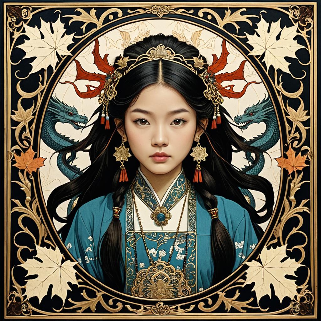 Gustave Doré-inspired oriental mulatto woman with beautiful hair and ethnic Japanese accessories, phoenixes hovering around her, intricate jewelry, chrysanthemum art nouveau frame, graphic painting in vector style, by Yuko Shimizu, Katsuya Terada, Yupito Quiroz-Jimenez